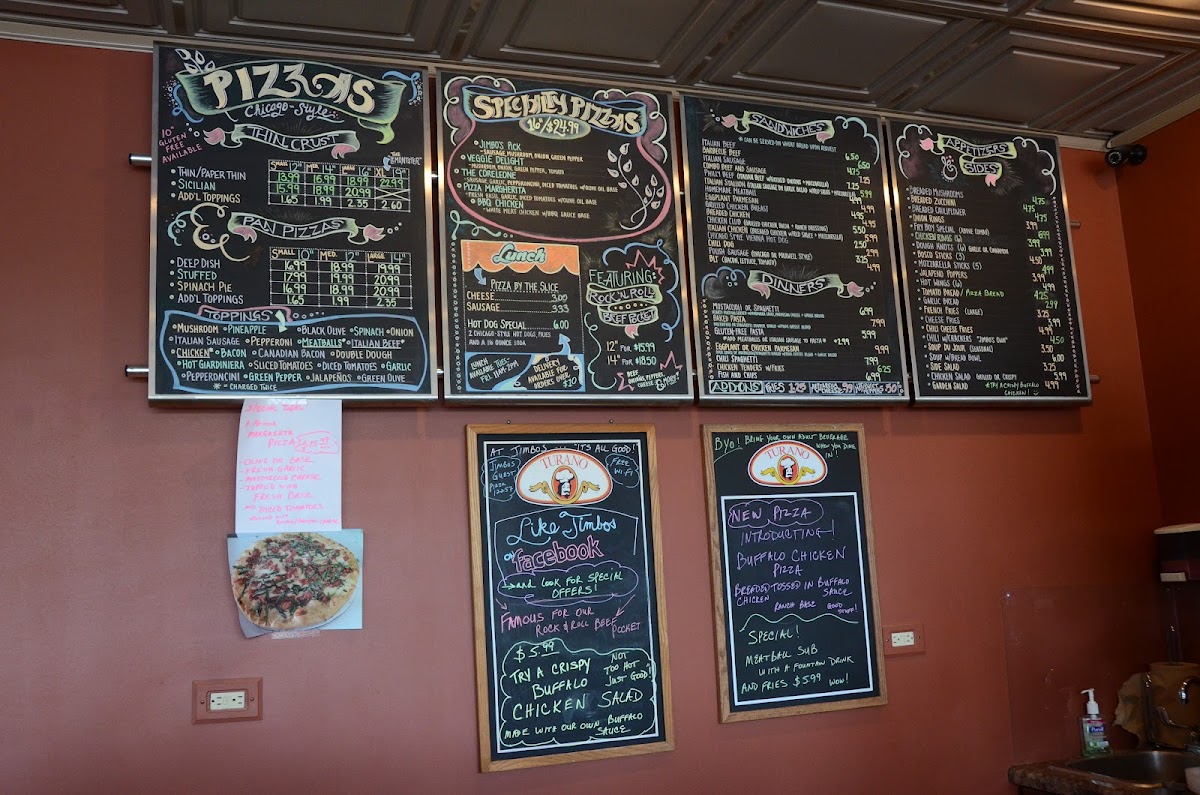 From a reviewer's perspective, Jimbo's Pizza at 12257 Walker Rd in Lemont offers a menu that caters to every craving. Sandwich lovers will find hearty options like the Grilled Chicken Sandwich, Grilled Chicken Club Sandwich, Italian Beef Sandwich, Italian Sausage Sandwich, and the Beef & Sausage Combo Sandwich. Dinner selections feature comfort classics such as Spaghetti, Baked Spaghetti, and Chicken Tenders With Fries, while the pizza offerings are extensive: from Thin Crust Cheese Pizza and Paper Thin Crust Cheese Pizza to the indulgent Double Dough Cheese Pizza and Thin Crust Gluten Free Cheese Pizza. The Jimbo's Pan Pizza section highlights the Deep Dish Cheese Pan Pizza, Stuffed Cheese Pan Pizza, and Spinach Pan Pizza, complemented by specialty choices like Jimbo's Pick Pizza, Veggie Delight Pizza, The Corleone Pizza, Pizza Margherita, and BBQ Chicken Pizza. For a portable option, the Rock & Roll Beef Pocket is a standout. Appetizers and sides such as Cheesy Garlic Bread, Fried Pickles, Toasted Cheese Ravioli, Bavarian Pretzels, and Sweet Potato Waffle Fries round out the menu, while salads like the Digs Chopped Salad, Digs Perfect Pear Salad, Digs Antipasto Salad, Garden Salad, and Chicken Salad offer lighter choices. Lunch specials provide quick, satisfying meals including Hot Dog Lunch Special, Cheese Pizza Slice, Sausage Pizza Slice, Pepperoni Pizza Slice, and One Cheese Pizza Slice With Fries & Drink. Jimbo’s also features calzones like the Cheese Calzone and Katie's Chicken Bacon Ranch Calzone, plus unique items such as The Knot 'Za. Weekly specials-from Tuesday Italian Beef Sandwich Special to Wednesday B.L.T. Sandwich Special, Thursday Meatballs Sandwich Special, and Friday Grilled Chicken Sandwich Special-keep the menu fresh. Pizza enthusiasts can also enjoy Pizza Specials like Sport Special 1, Sport Special 2, and the Family Meal Deal. Beverages are straightforward with Lemon Brisk Iced Tea, Soda, and Water, and kids aren’t left out with options like Chicken Tenders & Fries, Kids Spaghetti, Meatballs And Fries, The Little Lemonty, and The Meat Monster. For a touch of variety, Gelsosomo’s pizzas, including Gelsosomo's Cheese Pizza, Sausage Pizza, Pepperoni Pizza, Green And Red Pepper Pizza, and Half And Half Pizza, round out the menu. Overall, Jimbo’s Pizza provides a broad, approachable menu that balances classic comfort foods, creative pizzas, and flexible specials, making it a reliable choice for families, lunch crowds, and pizza aficionados alike.